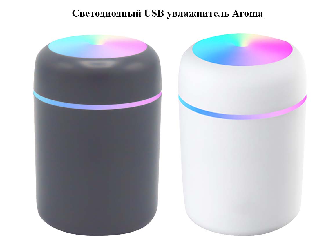 Светодиодный USB увлажнитель 2 в 1: увлажнитель и арома-диффузор AROMA, 7-ми цветовая динамическая радужная подсветка. Несколько капель эфирного масла на водорастворимой основе в воду увлажнителя, наполнит пространство ароматом и свежестью. Подходит для использования дома и в автомобиле.Цвет по PANTONE® (максимально приближен): Cool Gray 11 C.