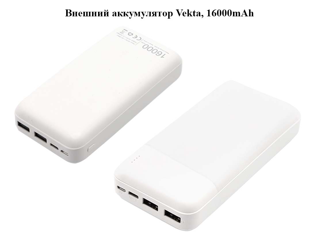 Внешний аккумулятор Vekta, 16000mAh, белый, 14х6,7х2,8 см